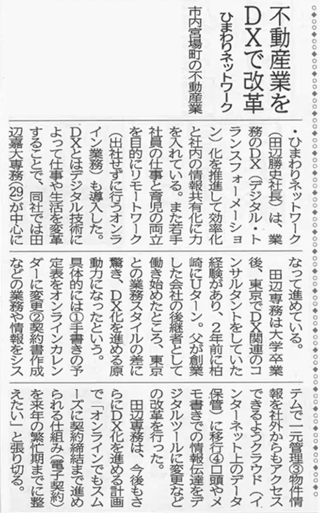 DX化の取り組みが柏崎日報に掲載されました。 プレスリリース 2025.10.07 弊社のDXの取り組みを柏崎日報に取りあげていただきました。古き良き伝統は守りつつ、前職の経験を活かしてIT活用を進めていきたいです。遠方の方からの問い合わせも増えているので、現地に来なくても契約を進められるように「IT重説」や「電子契約」も来春から開始する予定です。専務 田辺嘉大2025年10月6日月曜日(日刊・夕刊) next 柏崎市で転勤者向け賃貸アパートを探すなら?単身赴任に役立つ選び方を解説 2025.10.08