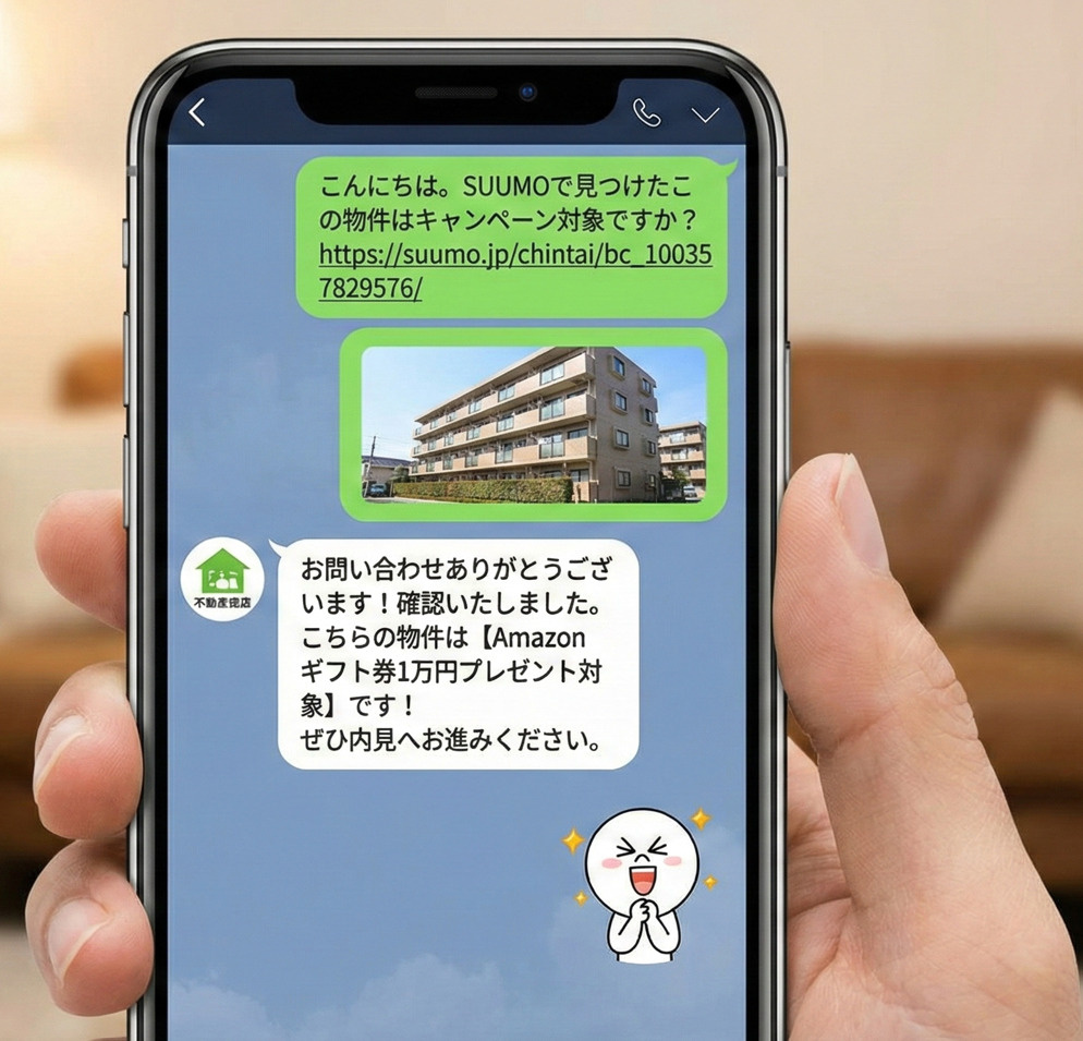 「この物件も1万円プレゼントの対象になりますか?」と、LINEからお気軽にお問い合わせください。